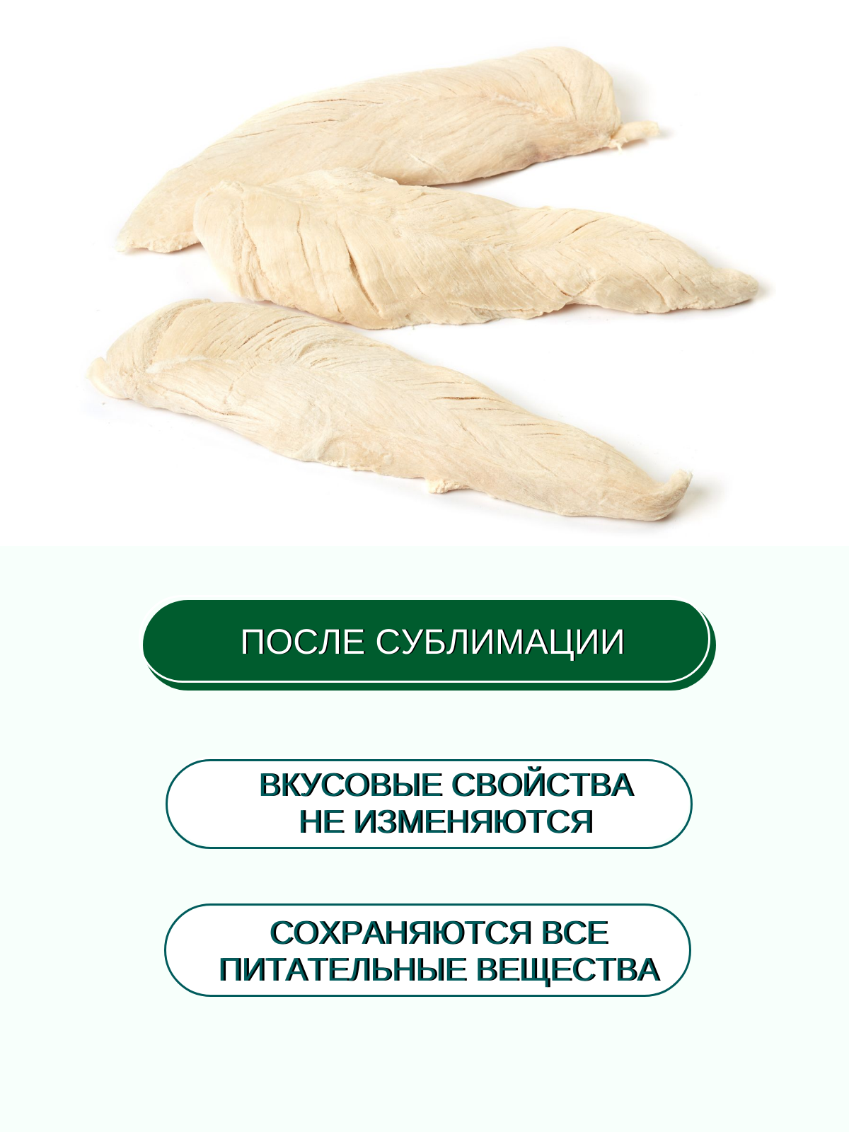 Лакомство состоит только из одного натурального ингредиента - курицы. Благодаря специальному процессу сублимации, все полезные вещества и витамины сохраняются в продукте, при этом он становится еще более вкусным и ароматным.