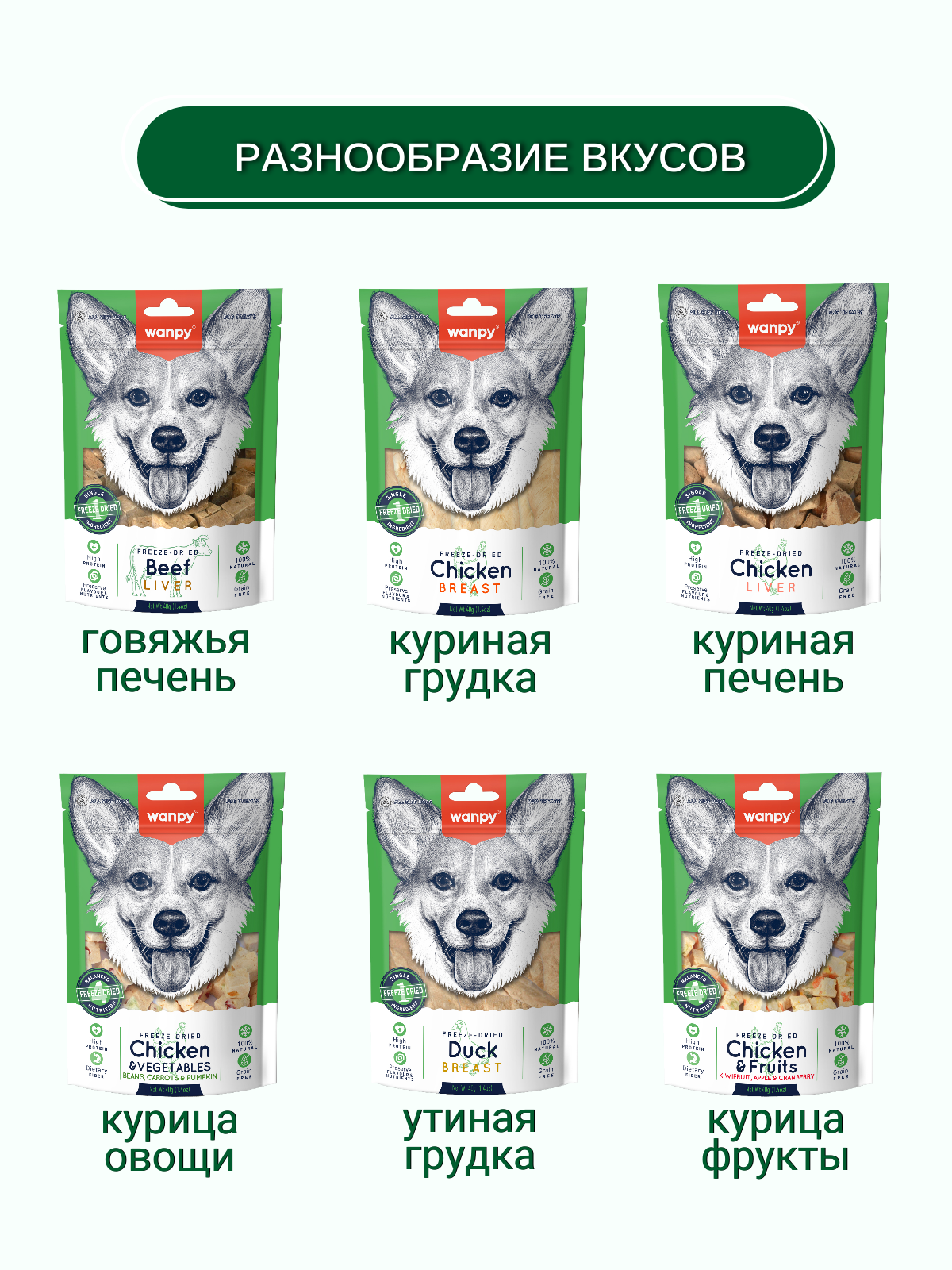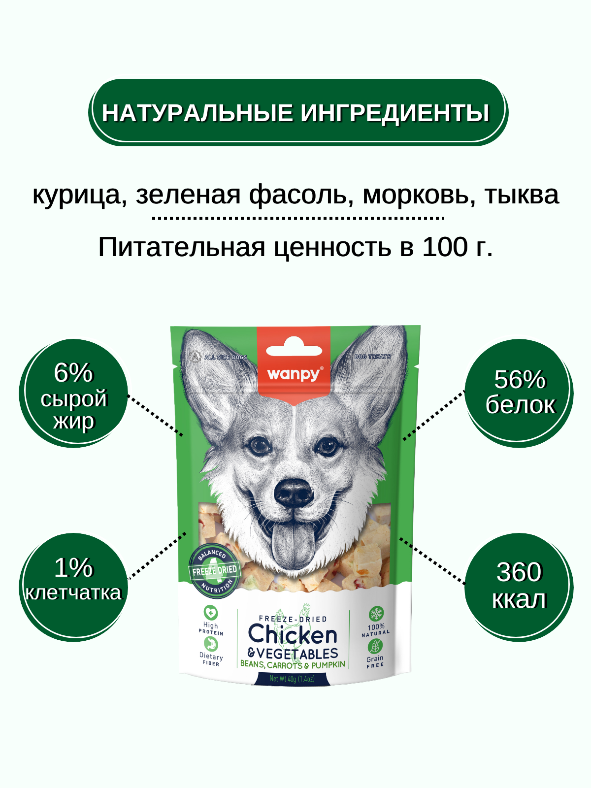 Wanpy Dog сублимированное лакомство для собак "Курица и овощи" - это уникальное и полезное угощение, которое сделает день вашего питомца ярче и вкуснее.