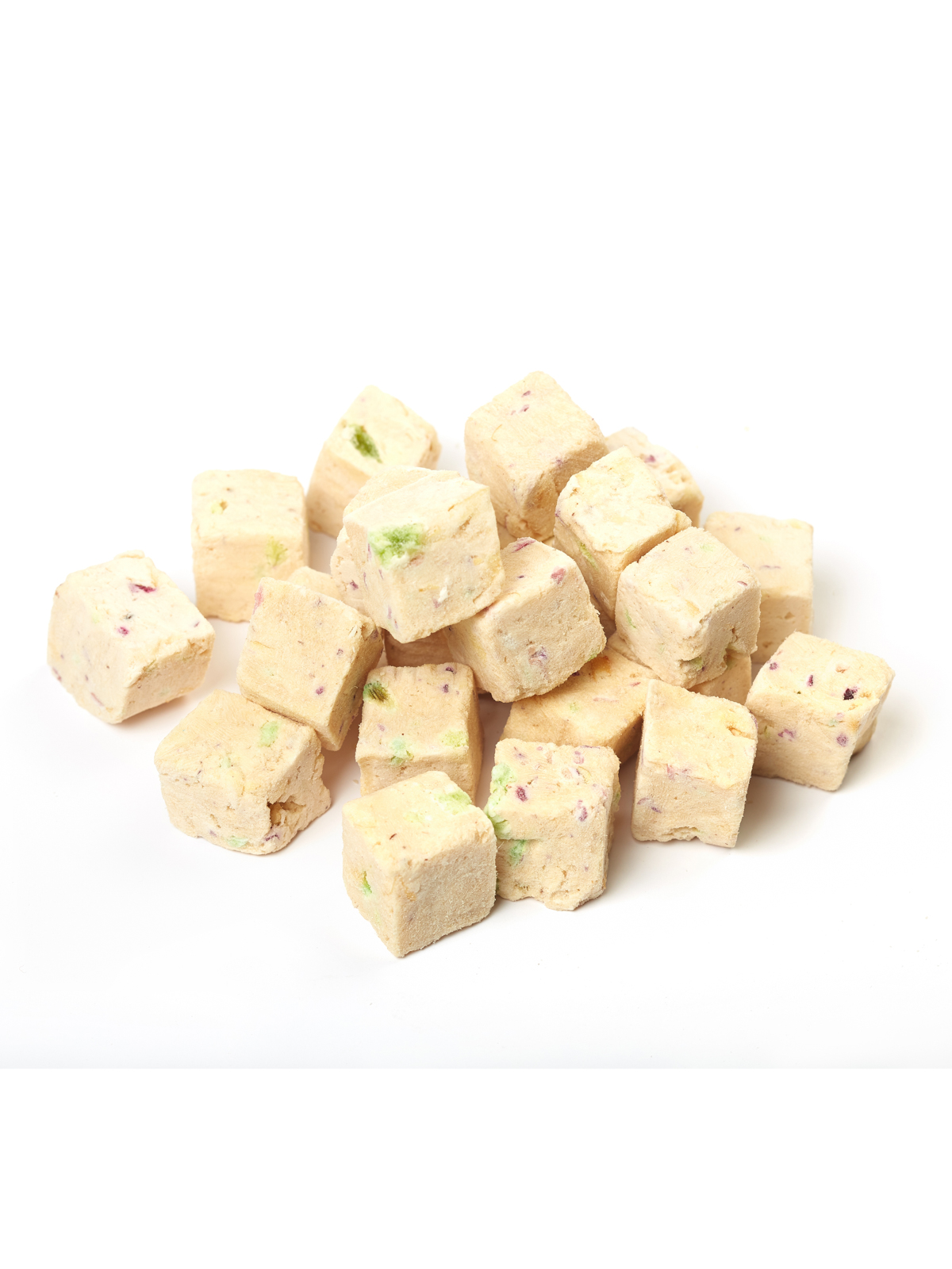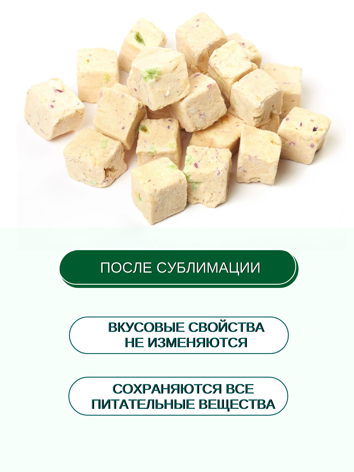 Лакомство состоит из натуральных ингредиентов - курицы, зеленая фасоль, морковь, тыква. Благодаря специальному процессу сублимации, все полезные вещества и витамины сохраняются в продукте, при этом он становится еще более вкусным и ароматным.